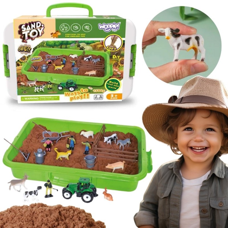 Zestaw Piasek Kinetyczny Farma w Walizce to wyjątkowa propozycja dla małych miłośników przyrody i wiejskiego życia. Ten duży zestaw sensoryczny (Sensory Box) zawiera aż 1500 g piasku kinetycznego w kolorze brązowym, który doskonale imituje ziemię uprawną. Całość zamknięta jest w dużym, zielonym pojemniku z rączką, który pełni funkcję przenośnej piaskownicy oraz kuferka do przechowywania. Dzieci mogą stworzyć własne gospodarstwo rolne, wykorzystując bogaty zestaw akcesoriów. W komplecie znajduje się zielony traktor, figurki rolników, zagrody oraz mnóstwo zwierząt gospodarskich, takich jak krowa, koń, owca czy świnka. Piasek jest miękki, przyjemny w dotyku i łatwy do modelowania, co pozwala na wielogodzinną, kreatywną zabawę. Dzięki praktycznemu opakowaniu, po skończonej zabawie w rolnika, wszystkie elementy można łatwo uporządkować i schować.