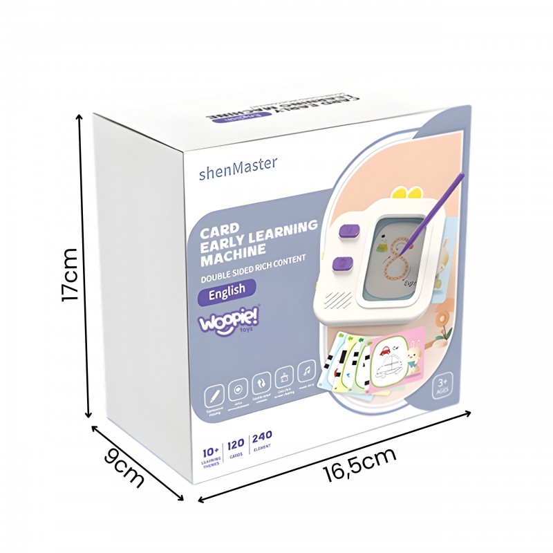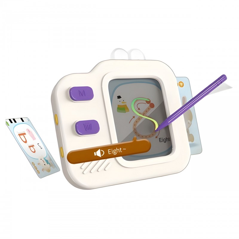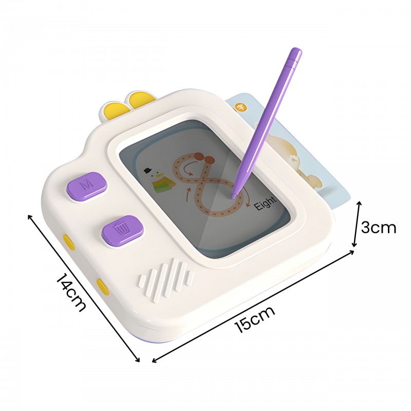 Tablet Graficzny do Nauki Rysowania i Języka Angielskiego od marki WOOPIE to innowacyjna zabawka edukacyjna 2w1, która łączy w sobie funkcję czytnika kart audio oraz znikopisu LCD. Dziecko może uczyć się słówek, wymowy oraz pisania w zabawny i interaktywny sposób. Po włożeniu karty do urządzenia, tablet odczytuje na głos angielskie słowo, a na ekranie wyświetla się ilustracja pomocnicza lub wzór do odrysowania. Dzięki specjalnej technologii ekranu LCD, zabawa jest bezpieczna dla oczu i nie emituje szkodliwego niebieskiego światła. To idealne narzędzie do wczesnej edukacji, rozwijające zdolności językowe i manualne jednocześnie.