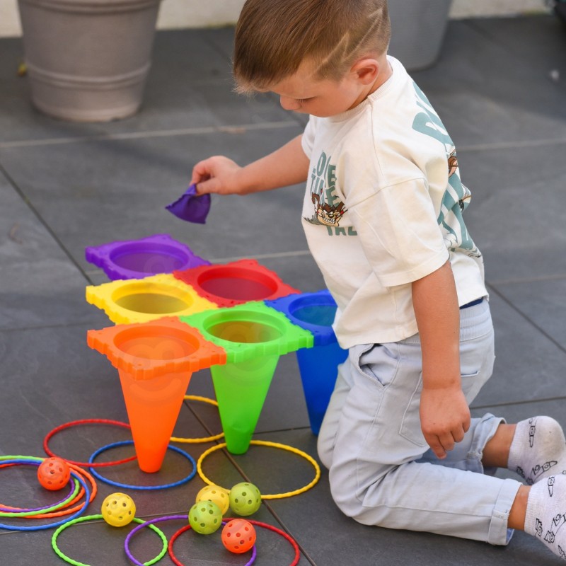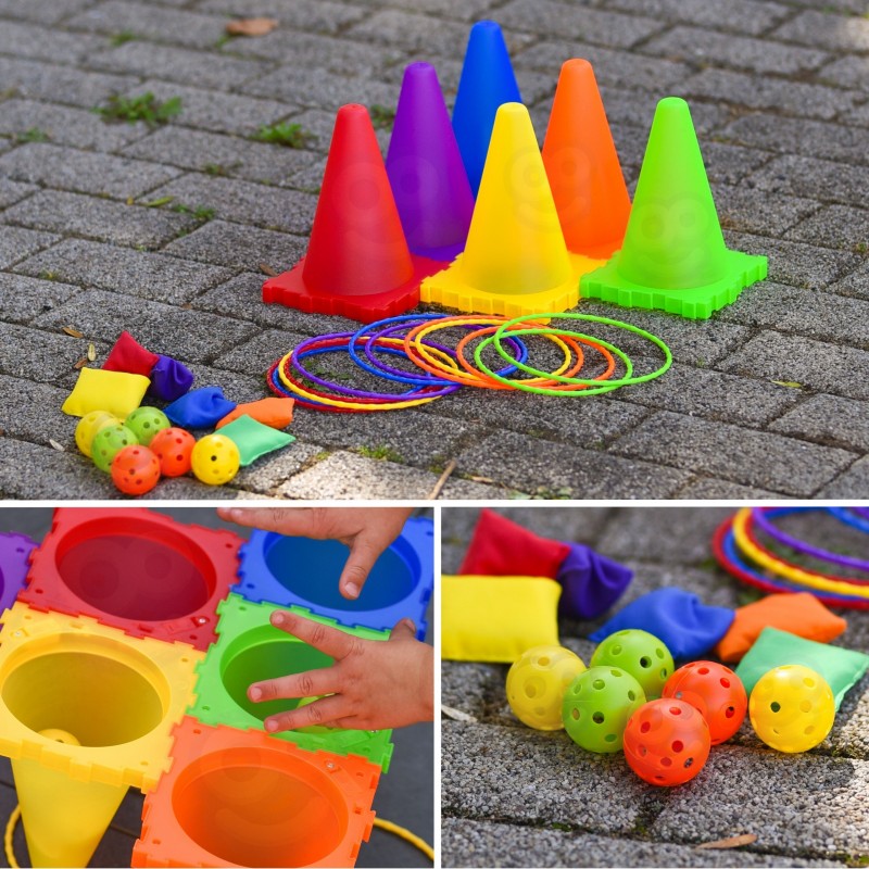 Zestaw Gier Ogrodowych 3w1 od marki Woopie to kompaktowy pakiet zabawy dla całej rodziny. Stożkowe pachołki, lekkie obręcze, miękkie woreczki i plastikowe piłeczki pozwalają tworzyć niezliczone konkurencje: rzut do celu, ringo na pachołki, slalom, tory przeszkód czy wyścigi drużynowe. Elementy są lekkie, trwałe i bezpieczne – idealne do domu, ogrodu, przedszkola i na zajęcia sportowe.