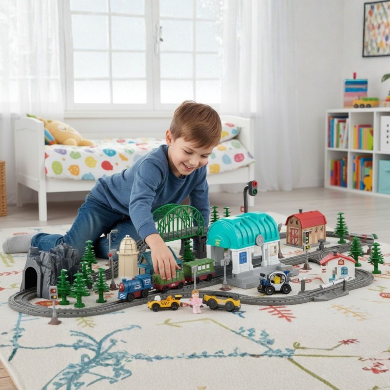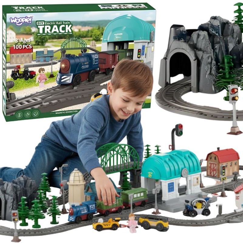 Przenieś swoje dziecko w świat ekscytujących przygód z rozbudowanym zestawem kolejki elektrycznej od Woopie. Ten kolorowy i bogaty w szczegóły komplet to doskonała propozycja dla małych fanów transportu, maszyn i budowania. W zestawie znajduje się klasyczna lokomotywa z realistycznymi efektami dźwiękowymi i świetlnymi, wagony towarowe, miniaturowe samochodziki, figurki postaci oraz wiele elementów scenerii – od tunelu i mostu po stację kolejową i znaki drogowe. Dzięki temu dziecko może tworzyć własne, niepowtarzalne trasy oraz historie z życia małego miasteczka kolejowego. Magnetyczne złącza pozwalają łatwo i stabilnie łączyć wagony, a ruch lokomotywy po torach wygląda jak prawdziwy przejazd kolejowy! To nie tylko zwykła kolejka – to cała mała sceneria miasteczka, w której dziecko może rozwijać swoją kreatywność, budując różne konfiguracje torów i odgrywając scenki z codziennego życia. Elektryczna lokomotywa jadąc po torach przejeżdża przez most i tunel, zatrzymuje się na stacji, a wszystko to z dźwiękiem i ruchem, który fascynuje najmłodszych. Dziecko uczy się planowania, logicznego myślenia i rozwija zdolności manualne, tworząc przy tym fascynujące scenariusze podróży i przewozu towarów. Zestaw składa się ze 108 elementów, wykonanych z trwałych i bezpiecznych materiałów, odpornych na intensywną zabawę.