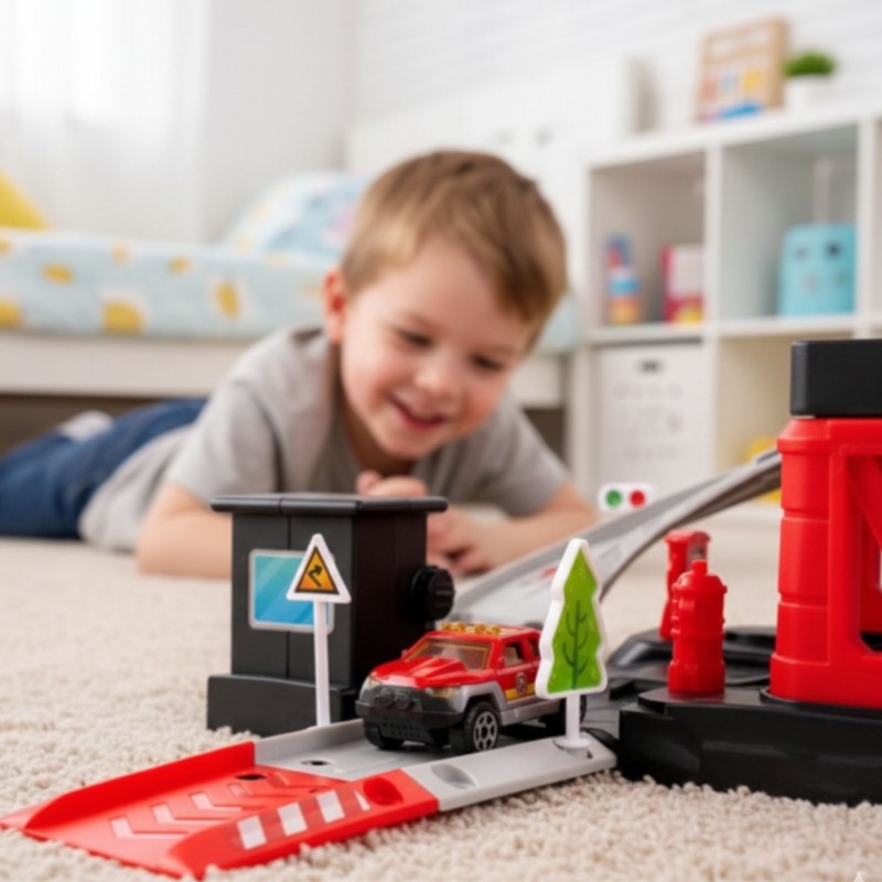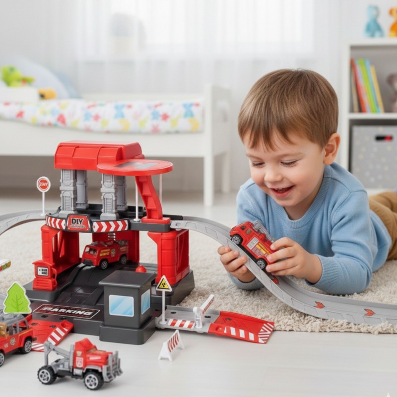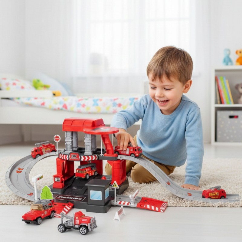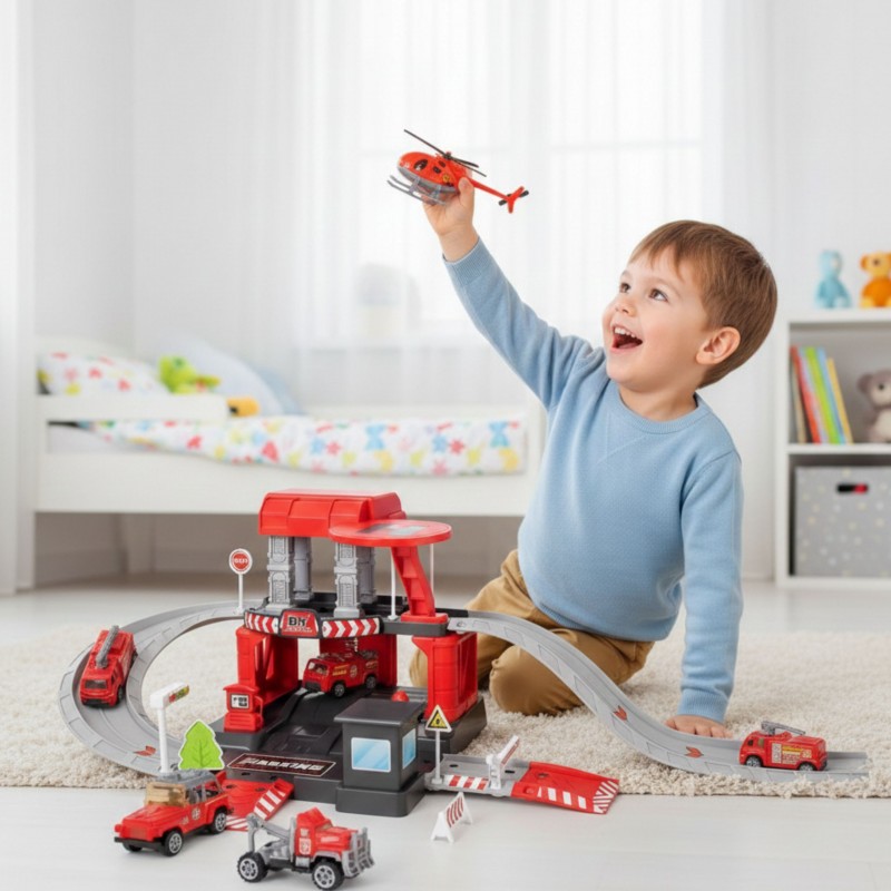 Parking straży pożarnej od marki Woopie z akcesoriami i pojazdami to fantastyczny zestaw tematyczny dla każdego małego miłośnika motoryzacji i służb mundurowych! Zabawka zachwyca bogactwem detali, ilością elementów, żywą kolorystyką i wieloma możliwościami zabawy. Dwupoziomowy parking z rampami, lądowiskiem dla helikoptera i licznymi akcesoriami pozwala dziecku na tworzenie własnych scenariuszy zabawy, ograniczonymi tylko wyobraźnią. Trzy metalowe samochodziki i helikopter pozwolą wykorzystać każdą z funkcji garażu i pozwolą na zabawę w gronie rodzeństwa lub przyjaciół oraz wcielenie się w postać małego strażaka.