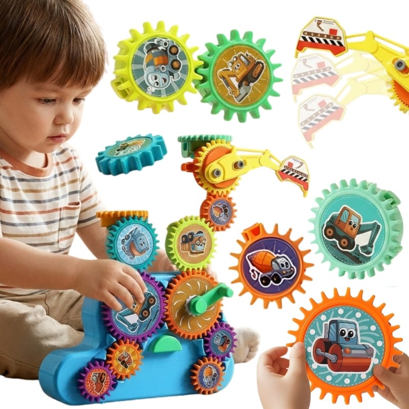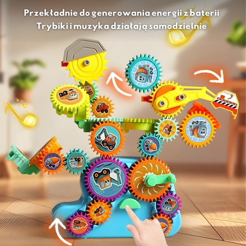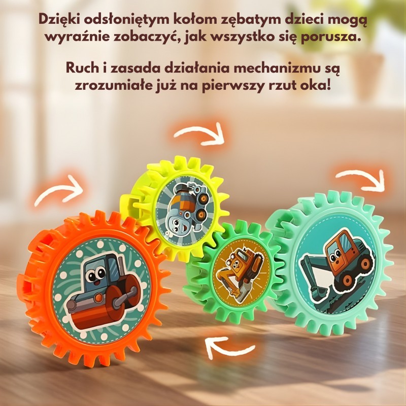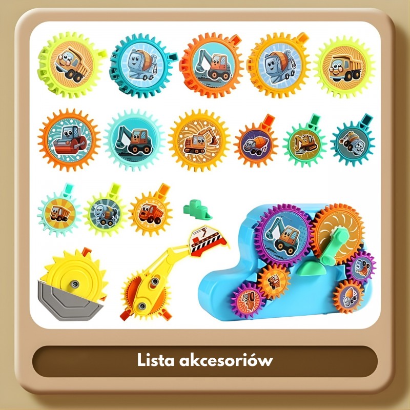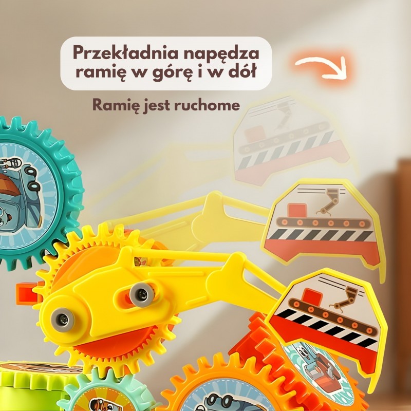 Zestaw interaktywnych klocków konstrukcyjnych od marki Woopie to fascynująca podróż w świat mechaniki dla najmłodszych. Składający się z kolorowych zębatek układ z motywem maszyn budowlanych pozwala na tworzenie ruchomych konstrukcji. Zabawka oferuje dwa tryby działania: zasilanie elektryczne (na baterie), które wprawia mechanizm w ruch przy akompaniamencie wesołej muzyki, oraz tryb ręczny, w którym dziecko samo obraca koła zębate za pomocą wygodnej korbki. Duże, bezpieczne elementy z grafikami koparki, wywrotki czy betoniarki idealnie pasują do małych rączek, zachęcając do kreatywnego łączenia i obserwacji, jak jeden poruszony element napędza kolejne, w tym ruchome ramię koparki.