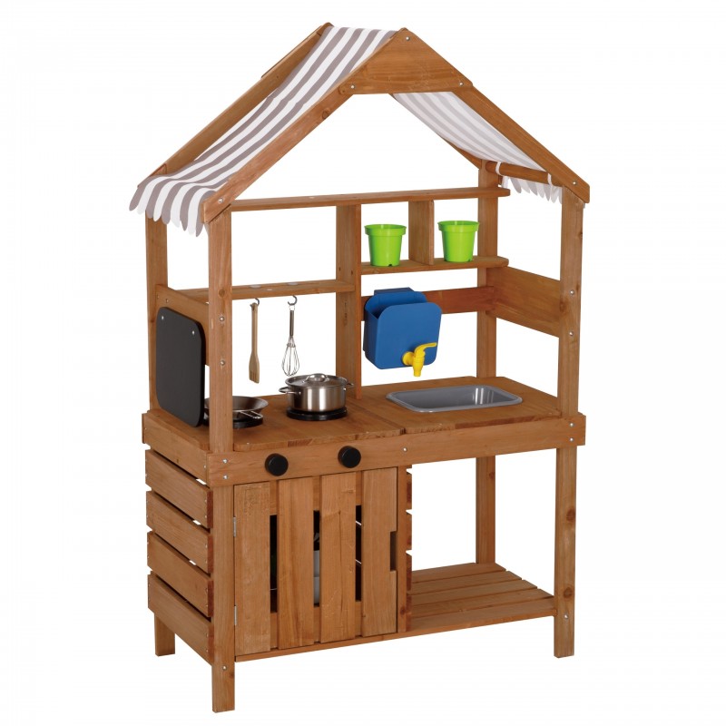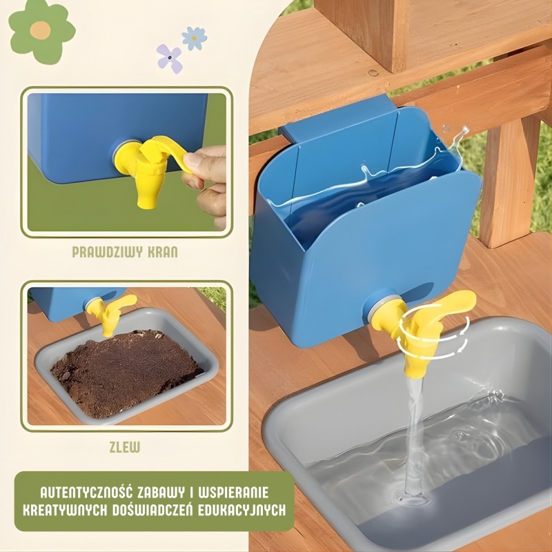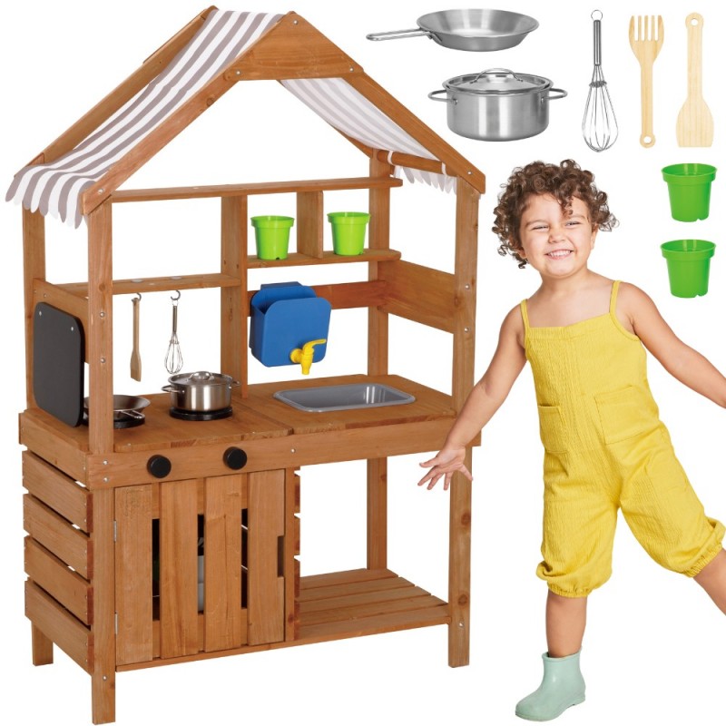 Drewniana Kuchnia Ogrodowa od marki WOOPIE to niezwykły zestaw, który zamieni Twój ogród, taras lub balkon w profesjonalne centrum kulinarnych eksperymentów. Ta solidna konstrukcja wykonana z litego drewna jodłowego pozwala dzieciom na bezpieczną zabawę z wodą, piaskiem i błotem, czyli tym, co maluchy lubią najbardziej. Kuchnia wyposażona jest w działający zbiornik na wodę z kranikiem, co sprawia, że zabawa staje się realistyczna i angażująca. Nad blatem znajduje się stylowy materiałowy daszek w paski, który chroni małych kucharzy przed słońcem podczas upalnych dni. Zestaw posiada zlew, palniki, tablicę kredową do zapisywania menu oraz półki i haczyki na przybory. Dołączone akcesoria, łączące świat kuchni i ogrodnictwa, pozwalają na wszechstronną zabawę – od gotowania "zupy z trawy" po sadzenie prawdziwych kwiatków w dołączonej doniczce.