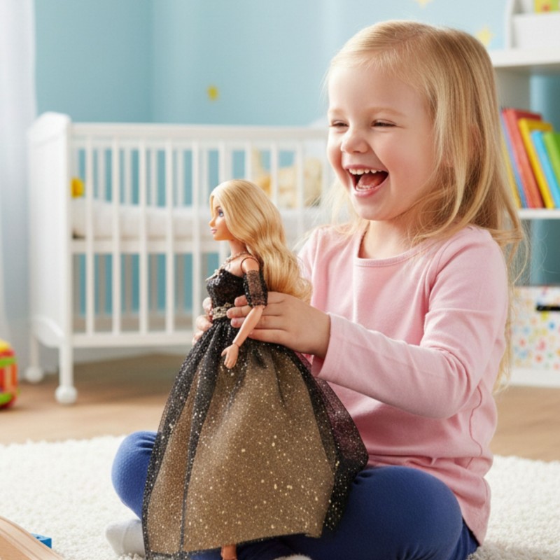Lalka Lily marki Woopie Royal to prawdziwa ikona stylu i elegancji! Zachwyca spektakularną wieczorową kreacją w odcieniach czerni i złota, ozdobioną tysiącami cekinów. Długie, złote włosy są idealne do tworzenia najpiękniejszych fryzur. Ta wyjątkowa lalka to inspiracja do zabawy w świat mody i eleganckich przyjęć.