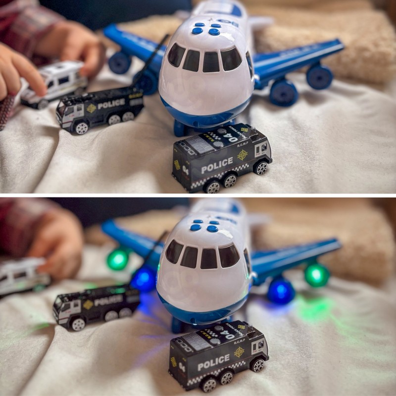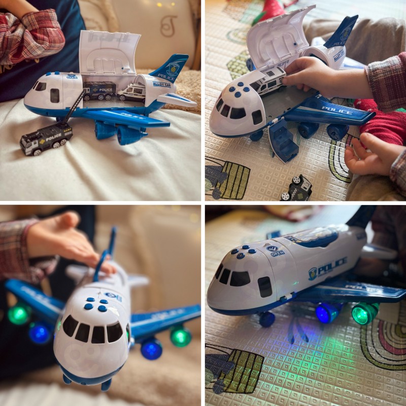 Poznaj DUŻY otwierany samolot-transporter policyjny od marki WOOPIE! który zabierze dziecko w ekscytującą misję stróżów prawa! W przestronnym kadłubie samolotu zmieszczą się trzy policyjne auta oraz komplet znaków drogowych, co zapewnia dynamiczną zabawę. Dzięki czterem przyciskom zabawka wydaje realistyczne syreny policyjne, a migające diody LED dodają akcji dynamiki. Rampa samolotu opada, a uchwyt ułatwia przenoszenie, co sprawia, że to zabawka mobilna i praktyczna. To wymarzony prezent dla małego policjanta od 3. roku życia, który rozwija wyobraźnię i uczy pracy zespołowej.