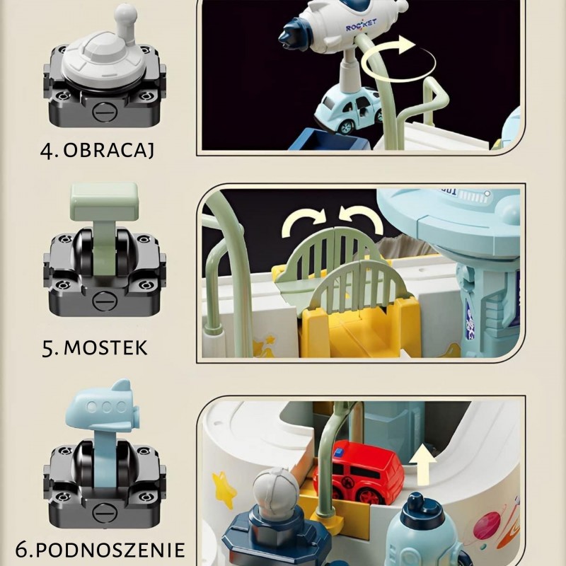 Interaktywny tor samochodowy "Kosmiczna Przygoda" to niezwykła zabawka, która przenosi dzieci do fascynującego świata kosmosu. Mali odkrywcy mogą wcielić się w role postaci eksplorujących kosmiczną bazę, jednocześnie pokonując różne przeszkody na torze samochodowym. Zabawka została wyposażona w mechaniczne dźwignie, wyrzutnie i interaktywne pokrętła, które dziecko musi obsługiwać manualnie, ćwicząc przy tym zręczność i koordynację. To idealne narzędzie do rozwijania wyobraźni i umiejętności manualnych, które jednocześnie dostarcza mnóstwo frajdy. Tor, zaprojektowany na wzór bazy kosmicznej, posiada wiele elementów, które sprawią, że dziecko poczuje się jak prawdziwy odkrywca kosmosu. Statki kosmiczne czy pojazd ufo dodadzą niesamowitego klimatu zestawowi, urozmaicając każdą zabawę.